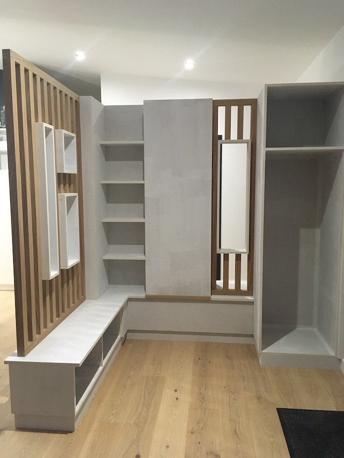 Projet d'aménagement d'une entrée avec placards de rangement, bancs, tiroirs à chaussures, étagères, cave à vin et niches décoratives, créé par Laurence DESFORGES, Architecte d'intérieur.